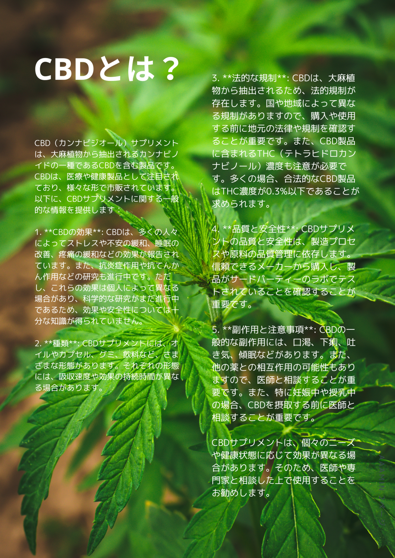 CBD(カンナビジオール)サプリメントは、大麻植物から抽出されるカンナビノイドの一種であるCBDを含む製品です。