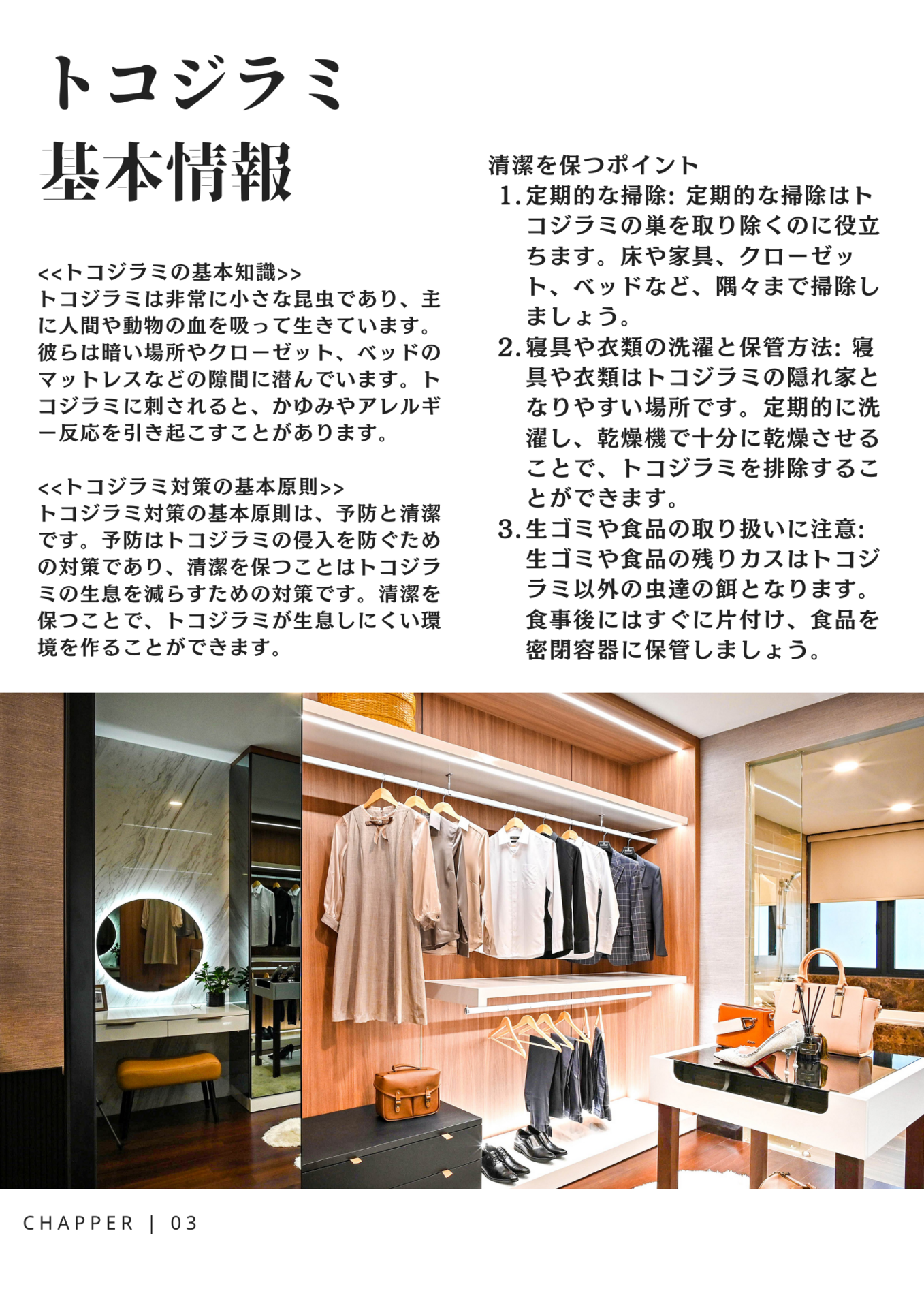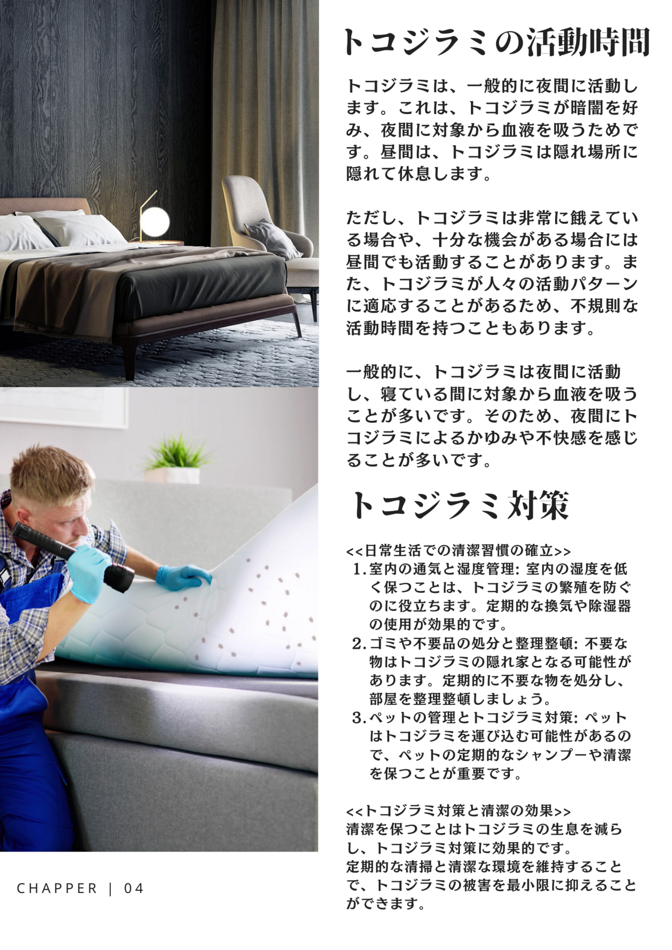 清潔を保つことで、トコジラミが生息しにくい環境を作ることができます。
